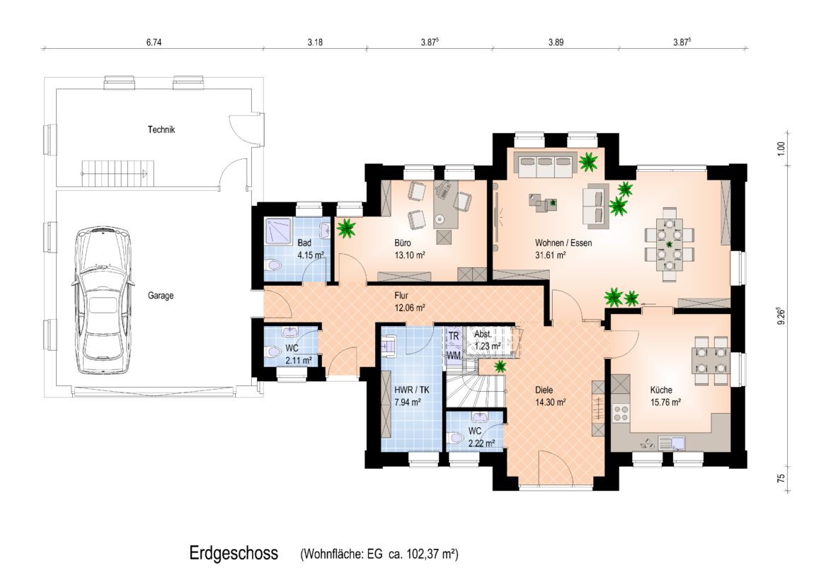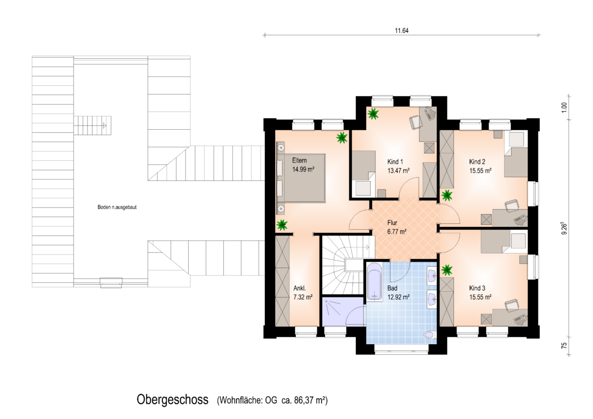 „Lüneburg„ präsentiert sich als zeitloses 2 Stock, das durch ein Walmdach abgerundet wird. Vier Schlafzimmer und zwei Badezimmer verteilen sich auf zwei Ebenen. Perfekt geeignet für große Familien, die großzügige Räume lieben. Die zentrale Treppe im Eingangsbereich verbindet alle Ebenen harmonisch miteinander.