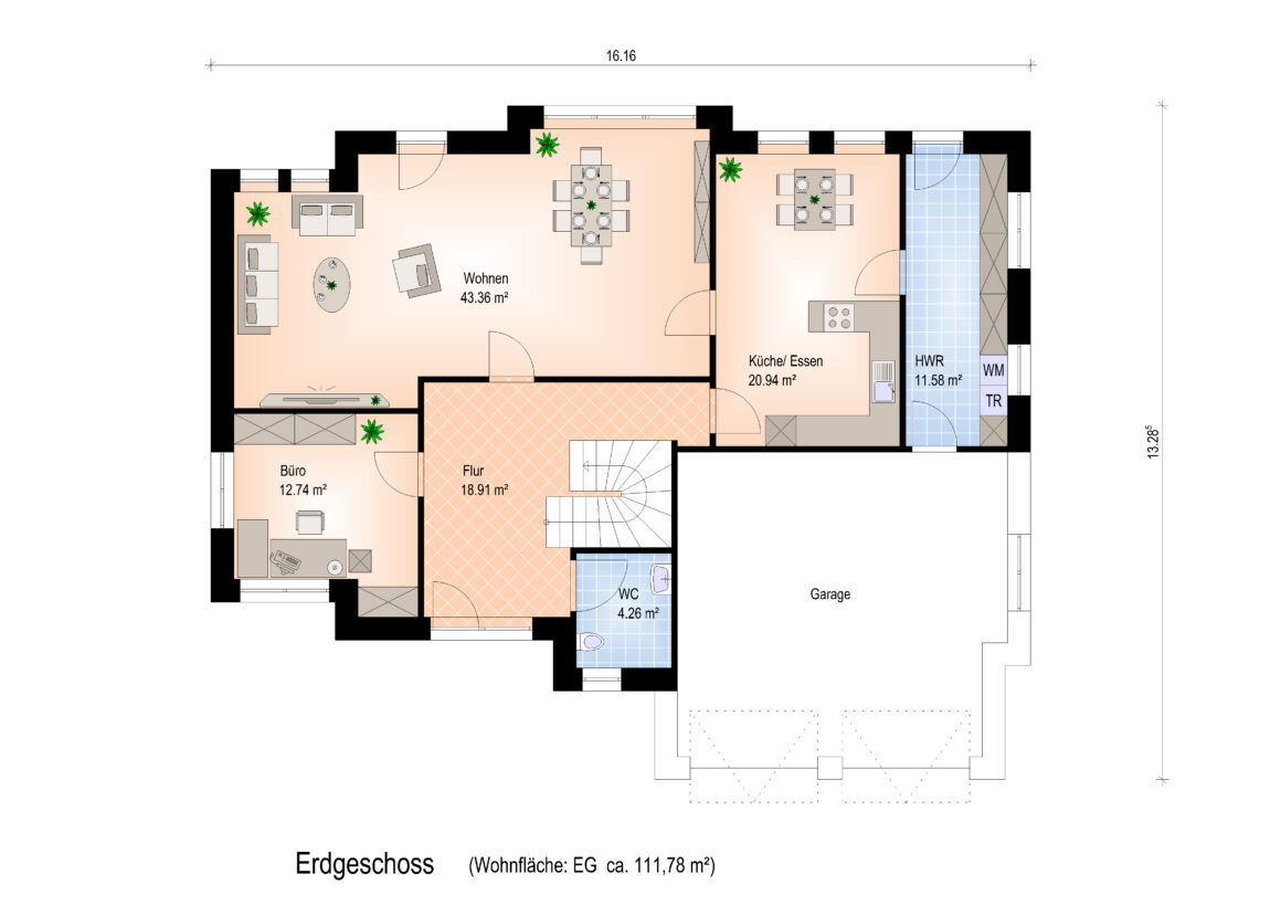 Entdecken Sie „Elsfleth„, ein zeitloses Giebelhaus, ausgestattet mit einem Satteldach. Ein Schlafzimmer und ein Badezimmer verteilen sich auf zwei Ebenen. Ideal für mehrgenerationale Familien mit viel Platzbedarf. Ein großzügiger Eingangsflur mit zentral platzierter Treppe sorgt für eine einladende Atmosphäre.