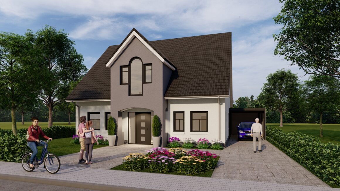 „Lohne„ präsentiert sich als zeitloses Giebelhaus, das durch ein Satteldach abgerundet wird. Dieses Haus erstreckt sich über zwei Geschosse und bietet drei Schlafzimmer sowie zwei Badezimmer. Eine hervorragende Wahl für Haushalte, die Raum und Komfort schätzen. Der Eingangsbereich führt in einen geräumigen Flur, von dem aus die Treppe ins Obergeschoss führt. Eine moderne Wohnküche bietet viel Platz für gemeinsame Kochabende und gemütliche Gespräche.