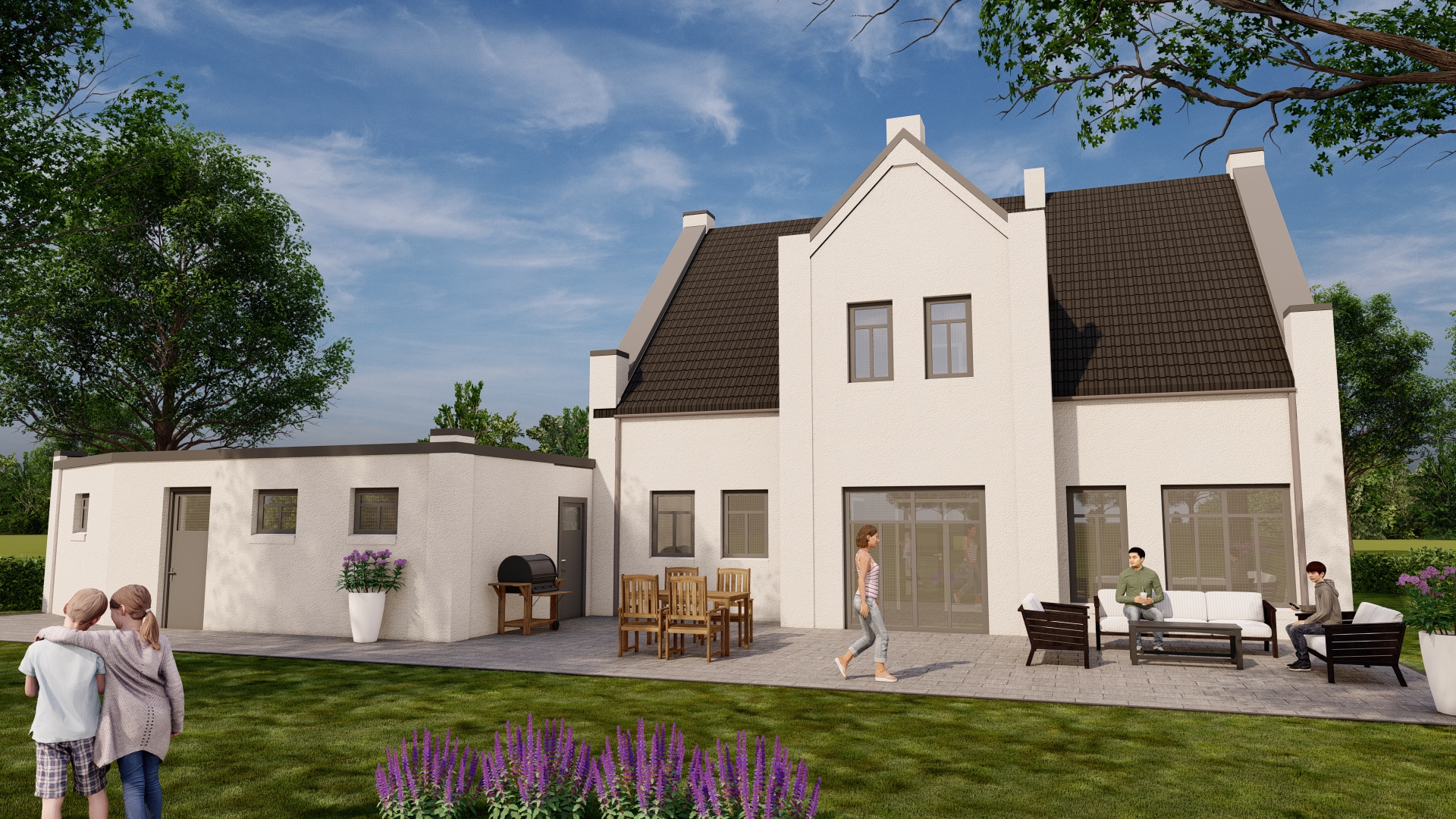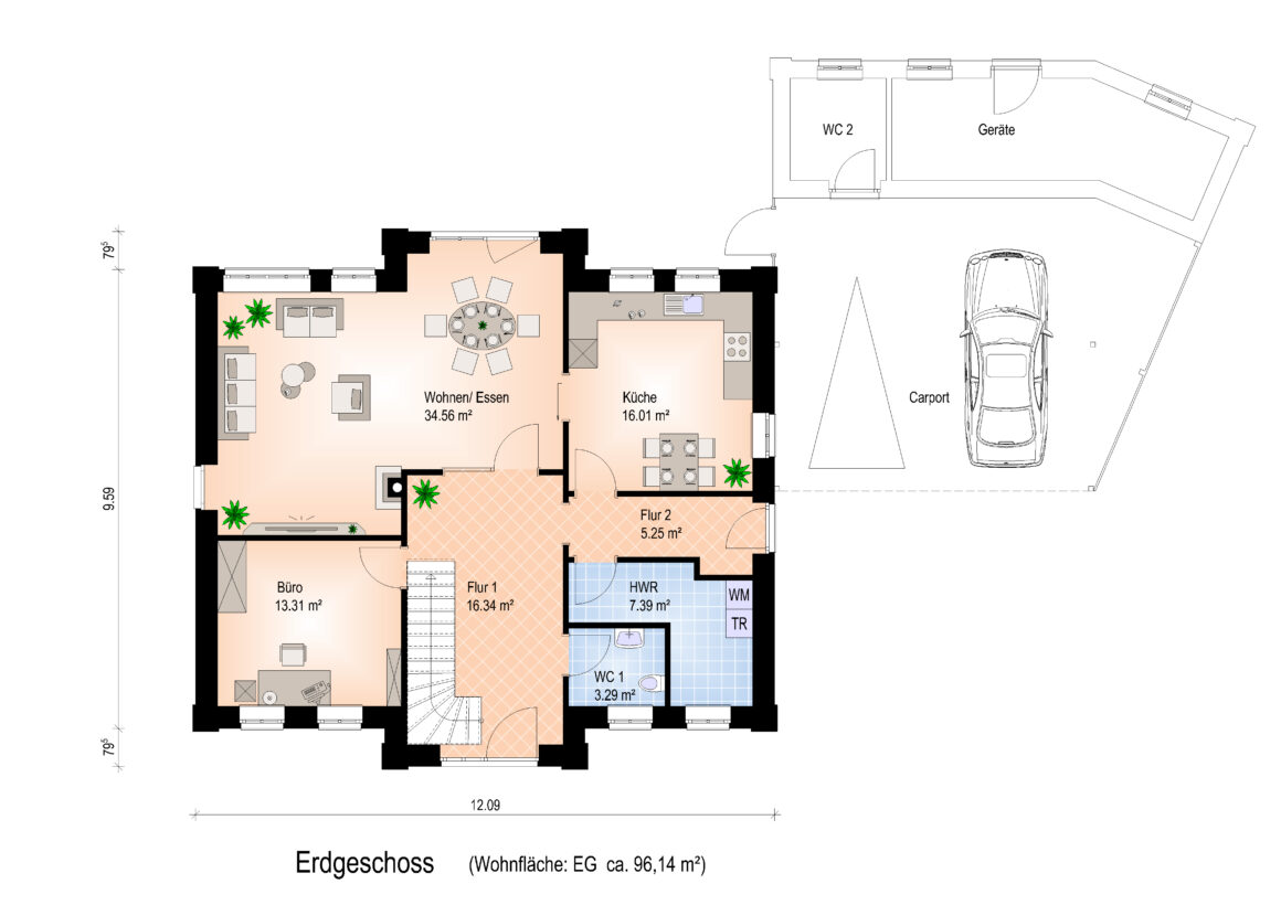„Wildeshausen„ präsentiert sich als zeitloses Giebelhaus, das durch ein Satteldach abgerundet wird. Dieses Haus erstreckt sich über zwei Geschosse und bietet drei Schlafzimmer sowie ein Badezimmer. Perfekt geeignet für große Familien, die großzügige Räume lieben. Die zentrale Treppe im Eingangsbereich verbindet alle Ebenen harmonisch miteinander.